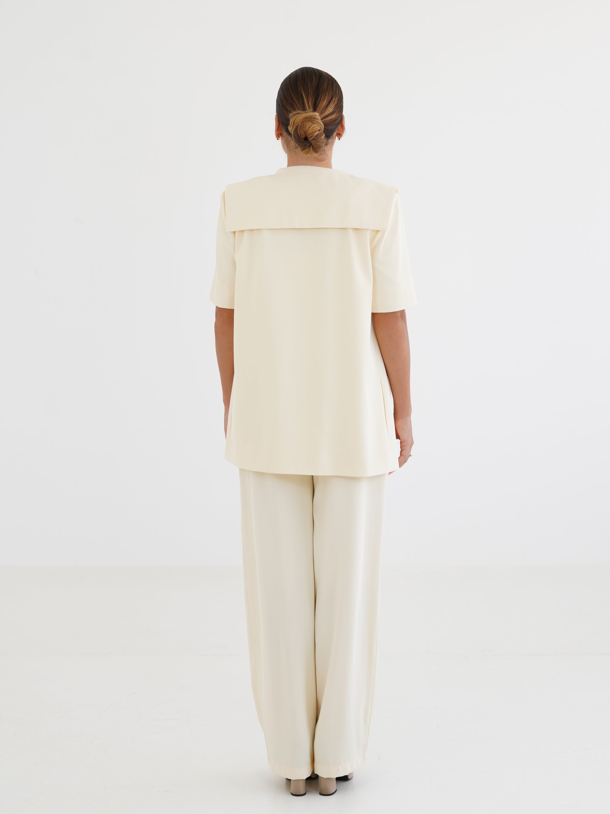 This Butter yellow double-breasted blazer offers a modern twist on classic tailoring. Featuring a wide notched collar, short sleeves, and a straight, relaxed fit, it delivers both structure and ease. The front is detailed with tonal buttons for a polished finish, while the clean back design adds to its streamlined look.