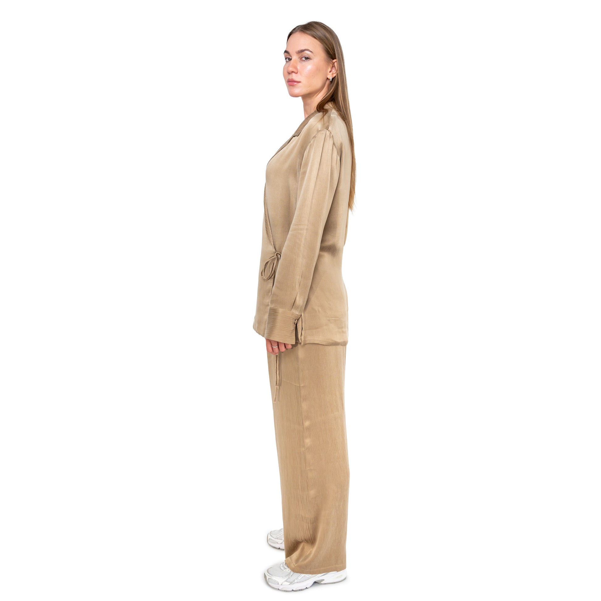 Refined and relaxed, the Caia Set in Desert Glow brings soft structure and understated luxury to everyday dressing. The wrap-style top and wide-leg trousers are crafted from a lightweight textured fabric, offering comfort with a subtle sheen — ideal for both lounging and stepping out.