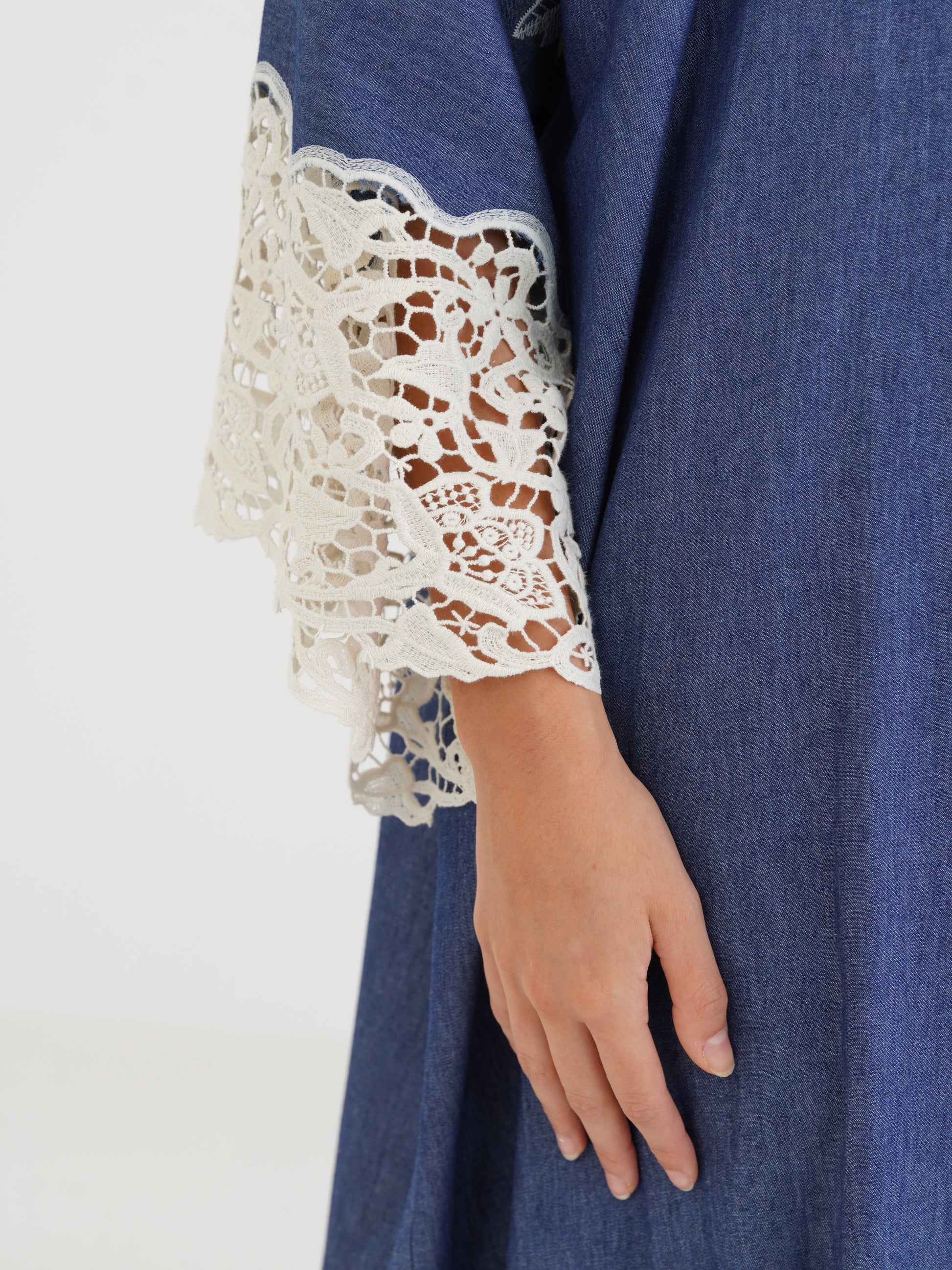 The Dei abaya blends contemporary denim charm with intricate crochet sleeve panels for a unique, refined statement. Crafted from premium Italian fabric, it features a relaxed open-front design with a tie closure and wide, flowing sleeves, offering both comfort and elegance, perfect for layering over casual or dressy looks.