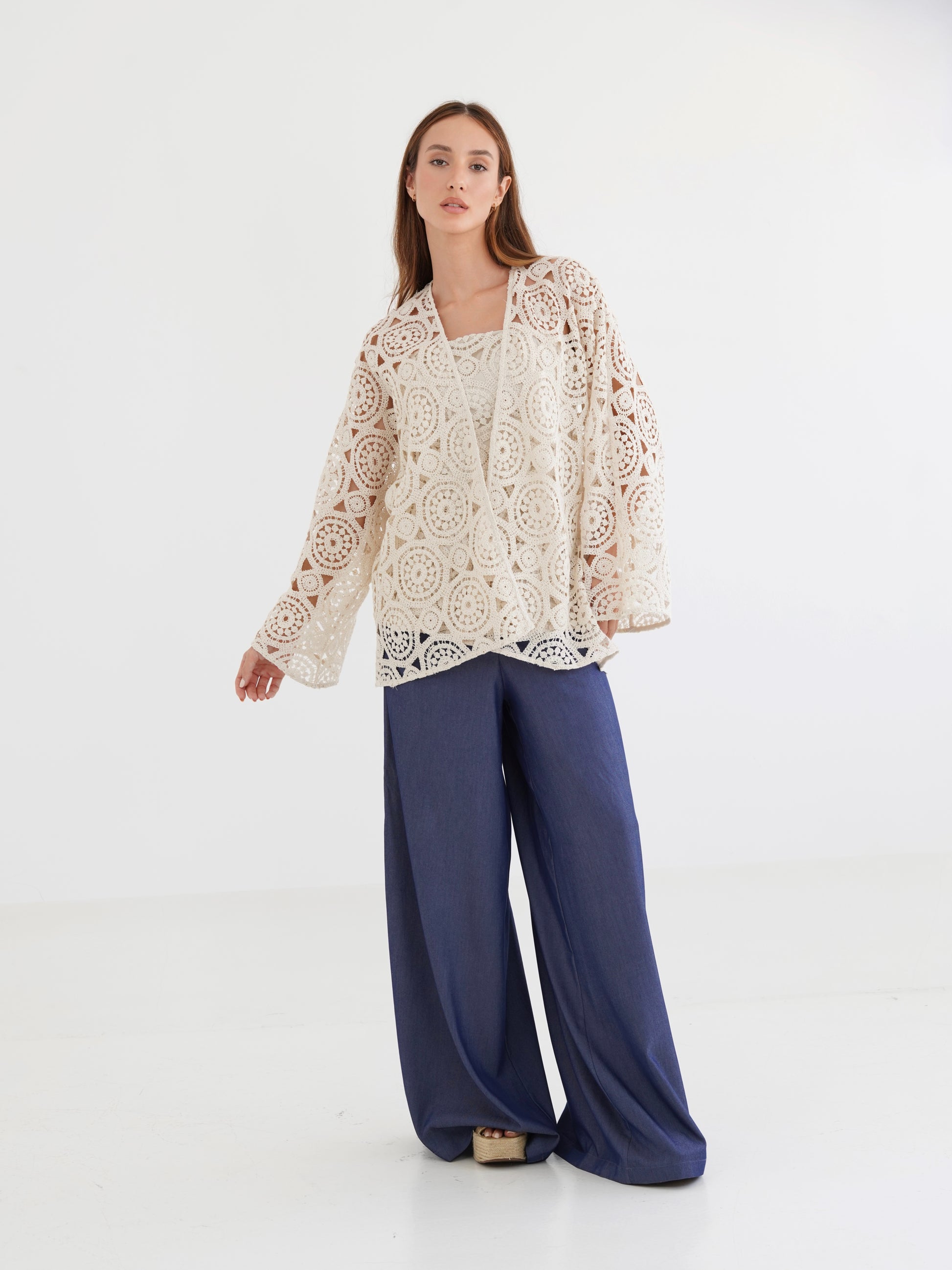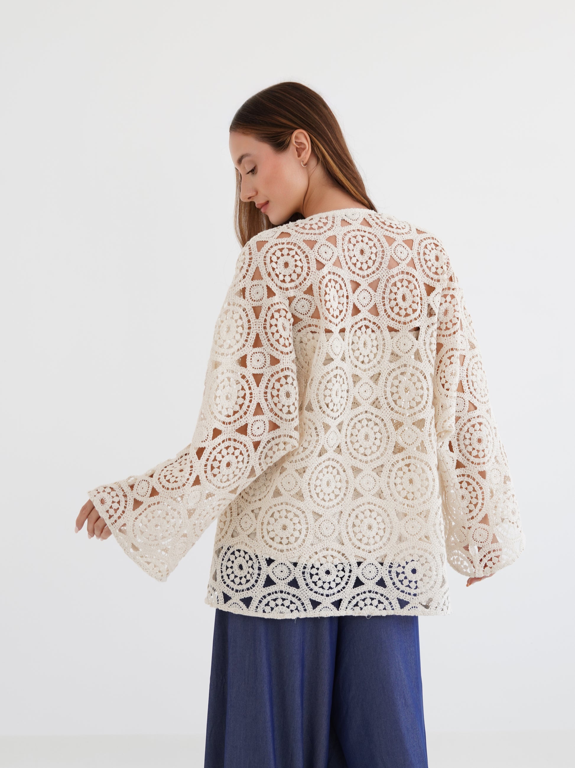 The Elaya Kimino is a lightweight layering piece crafted from intricate circular crochet lace. Featuring wide sleeves, an open-front design, and a relaxed silhouette, it drapes effortlessly over any outfit, adding texture and artisanal elegance. Sold as a set with the matching strapless corset top, it offers versatility and refined bohemian style, perfect for layering over dresses or pairing with casual separates for an elevated, effortless look.
