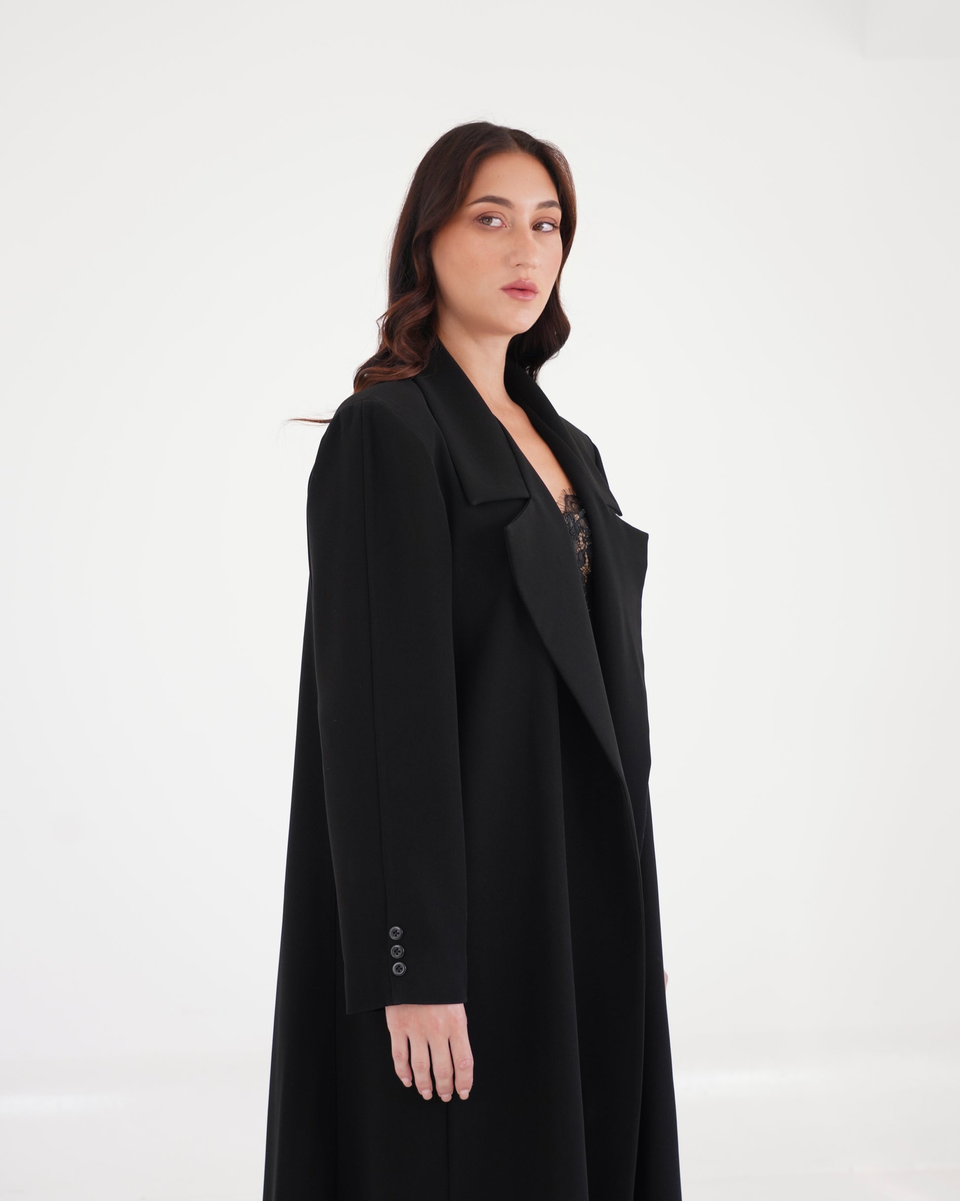 The Layl Blazer Abaya embodies modern elegance with its fluid silhouette and tailored precision. Crafted in deep noir, it features structured lapels and a soft drape that flows effortlessly with every movement. The design strikes a perfect balance between strength and grace — ideal for evening occasions or elevated everyday wear.