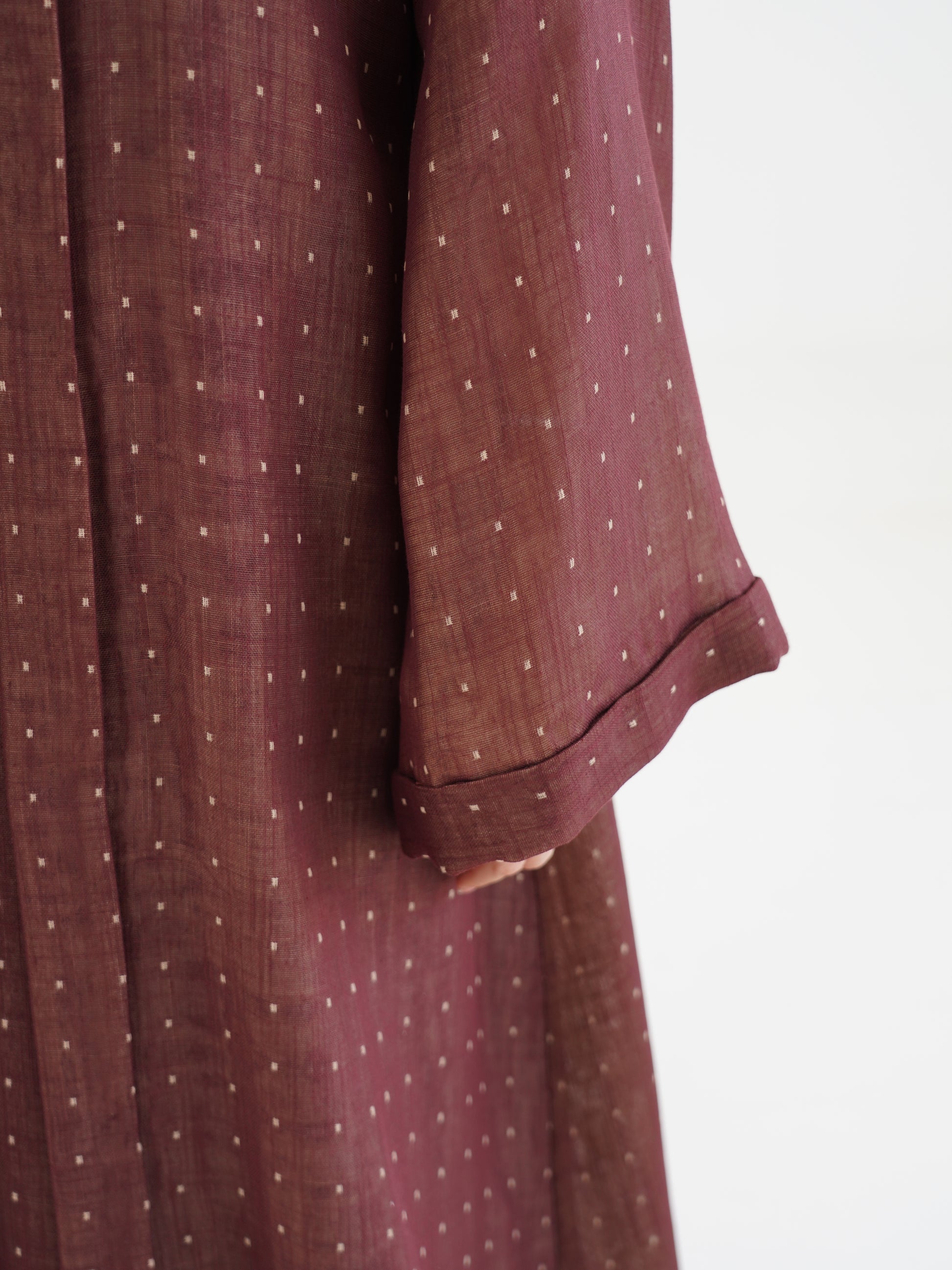 The Noqta Abaya redefines effortless elegance with its flowing silhouette and refined detailing. Designed in a rich maroon tone with soft dotted texture, this abaya blends minimal structure with graceful movement. The subtle sheen of the fabric adds depth, while its lightweight feel makes it ideal for all-day wear. It comes as a complete set with a matching inner dress and scarf for a cohesive, polished look.