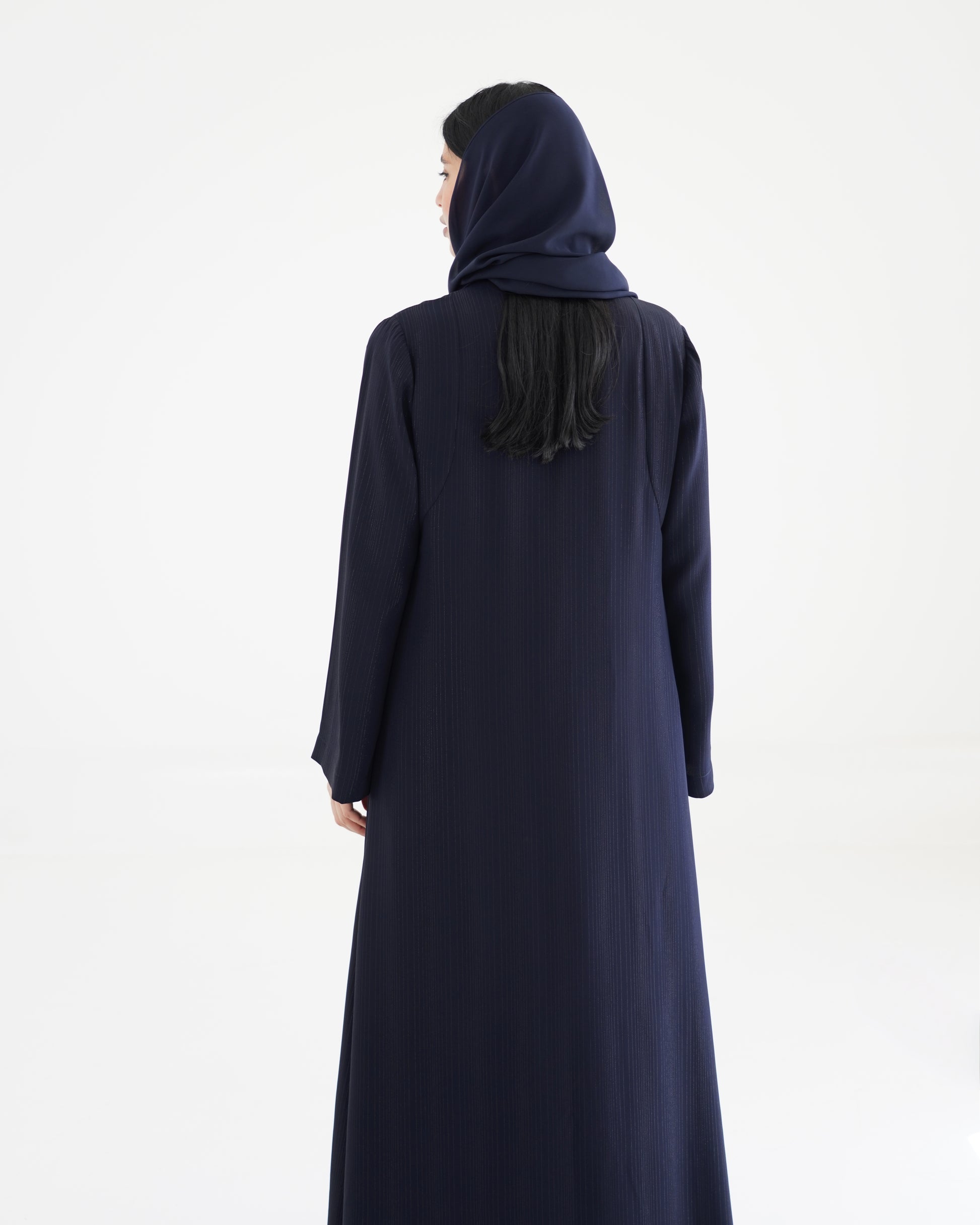 An elevated take on classic tailoring, this navy blue blazer abaya is crafted from luxurious Japanese crepe with delicate metallic pinstripes that catch the light with every movement. The double-breasted silhouette and structured lapel bring quiet sophistication to a timeless shape, designed to move with ease and confidence.