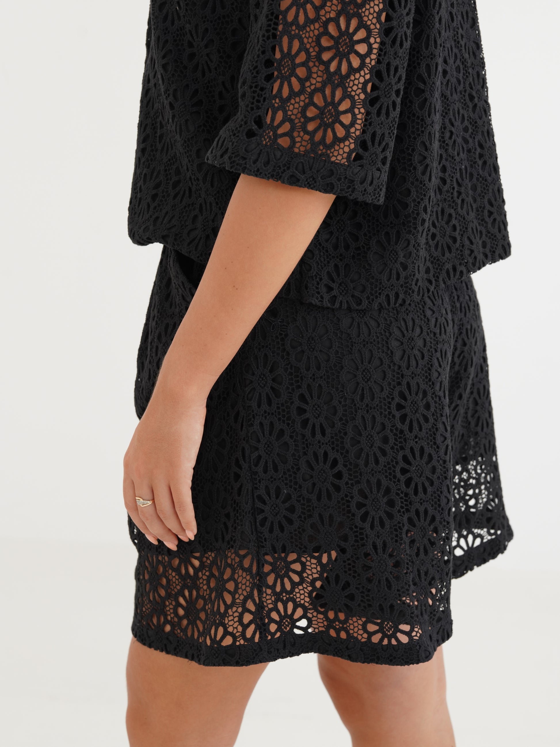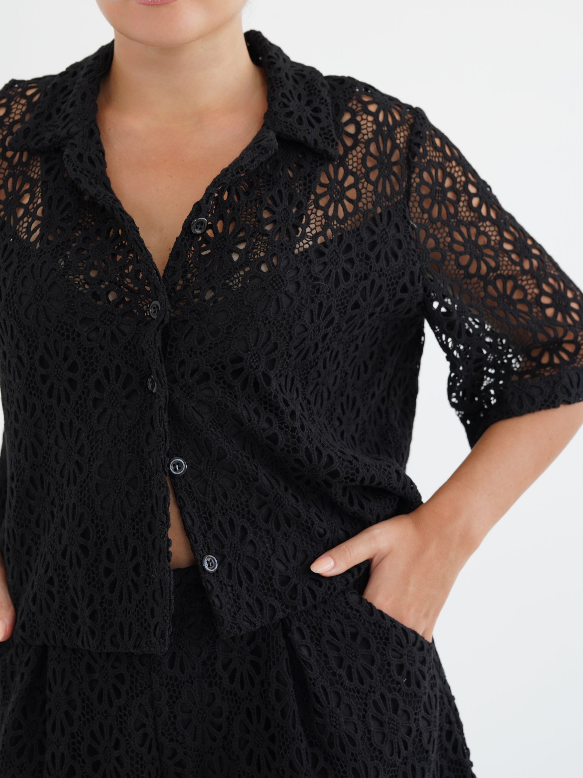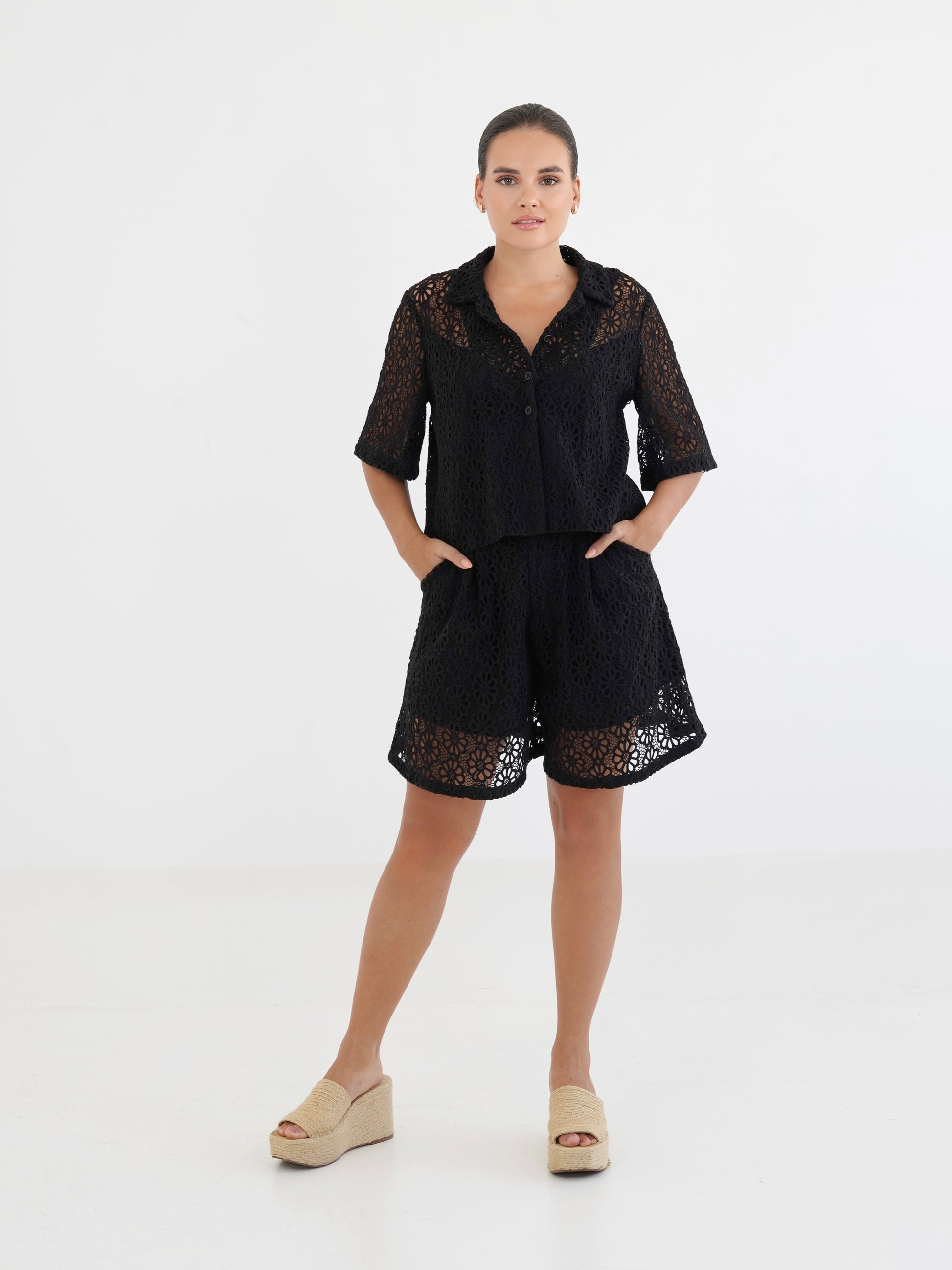 The Set brings a chic twist to summer dressing with its all-black, airy crochet lace design. The button-up shirt features a relaxed fit, half sleeves, and a classic collar for effortless style, while the matching high-waisted shorts offer comfort and ease with side pockets and a soft lining. Perfect for warm days and stylish getaways, this set blends casual comfort with understated elegance.