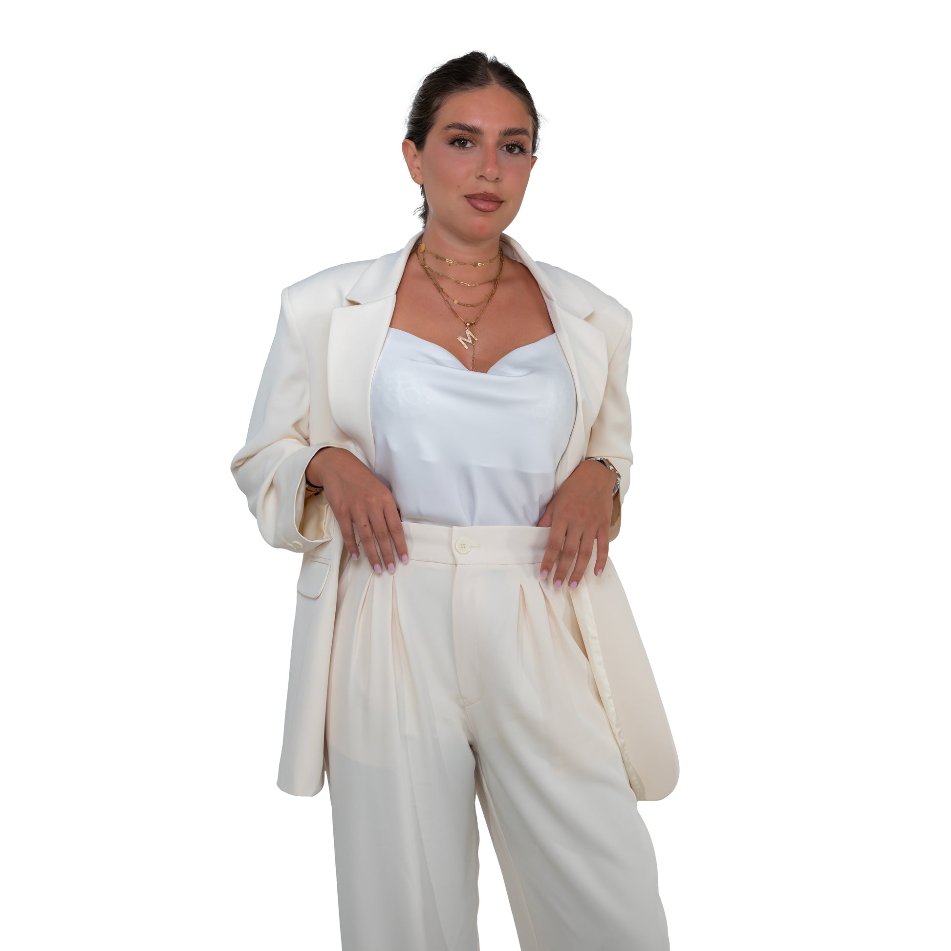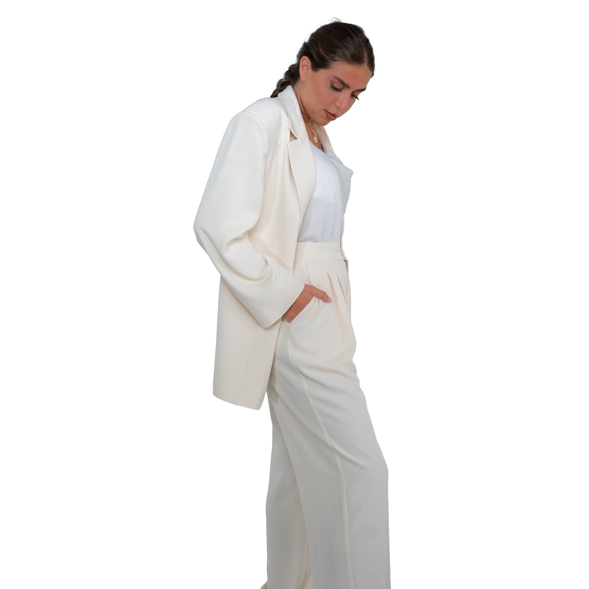 Crisp, clean, and effortlessly refined — the Ëdit Trousers in Ivory Cloud offer a timeless silhouette with modern ease. Featuring a high-rise waist, soft front pleats, and a wide-leg cut, these trousers are designed to elongate and empower. Made to pair seamlessly with the matching blazer or elevate any outfit with soft structure and polish.