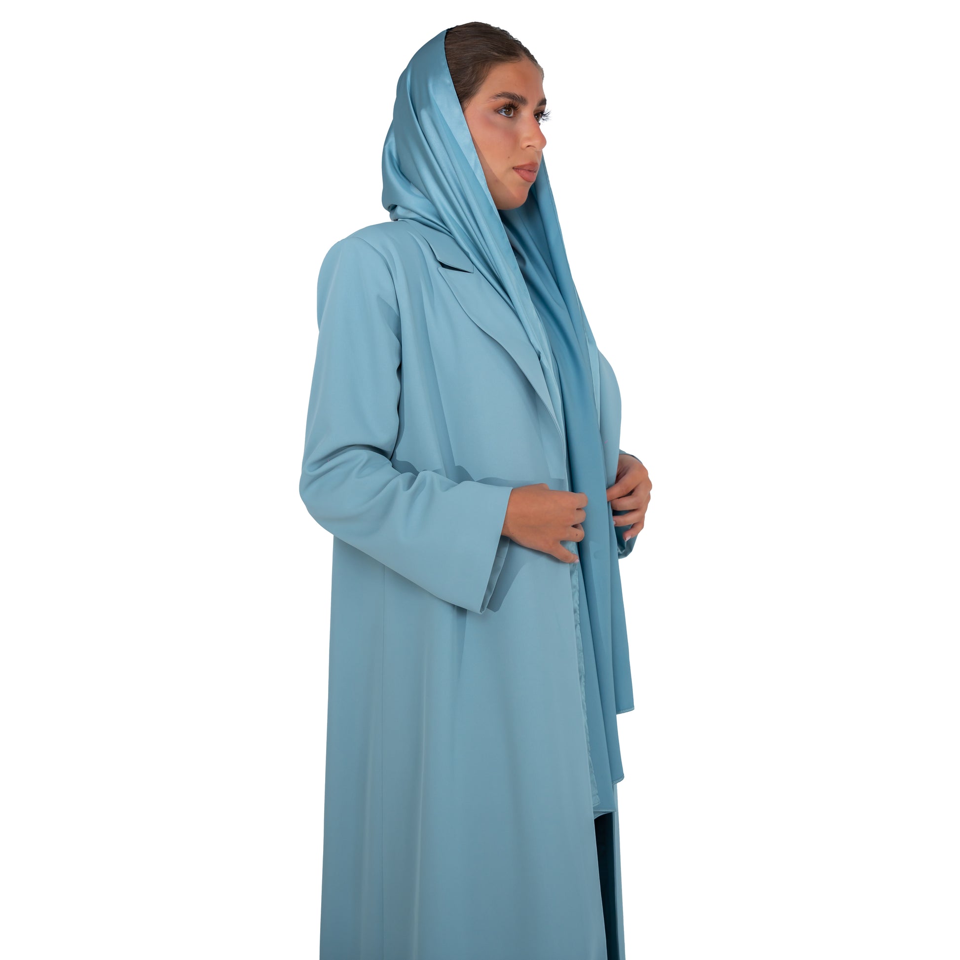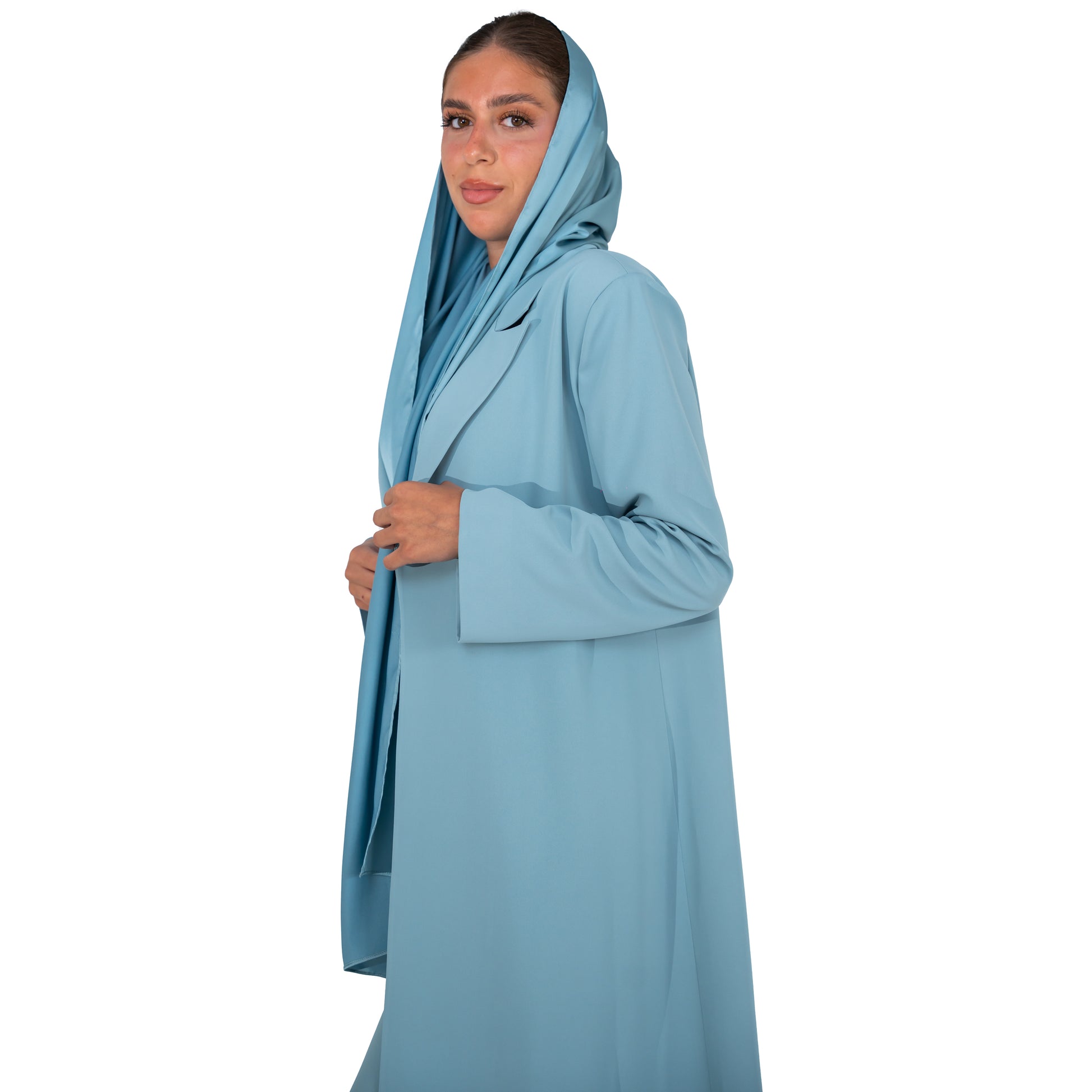 A fresh take on quiet power. The Ëdition Abaya in Celestial Blue merges classic modesty with clean, modern tailoring. Designed with a structured lapel, flowing silhouette, and fluid fabric, this piece brings a serene strength to every step. The cool-toned blue evokes clarity, calm, and understated confidence — perfect for elevated daytime wear or soft-statement occasions.