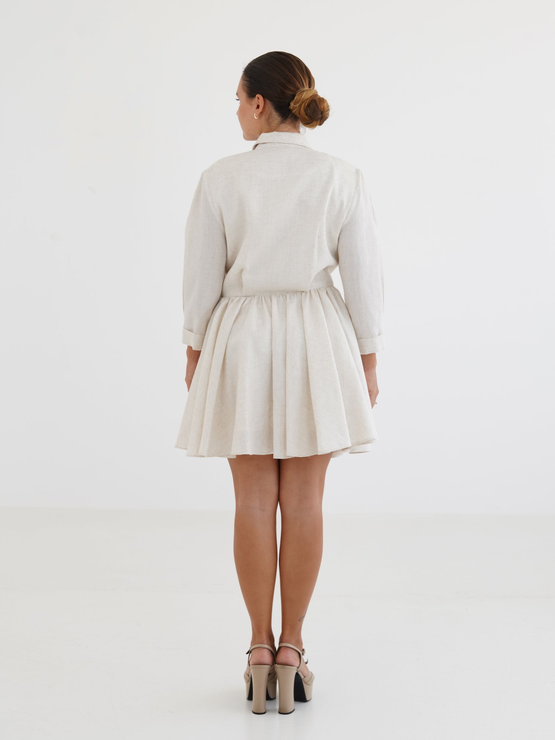 Twi is a blazer-inspired linen dress that blends sharp tailoring with playful movement. Designed in a soft natural hue, it features structured lapels, a single-button closure, and a fitted waist that flows into a flared, asymmetrical skirt. With its three-quarter sleeves and lightweight linen fabric.