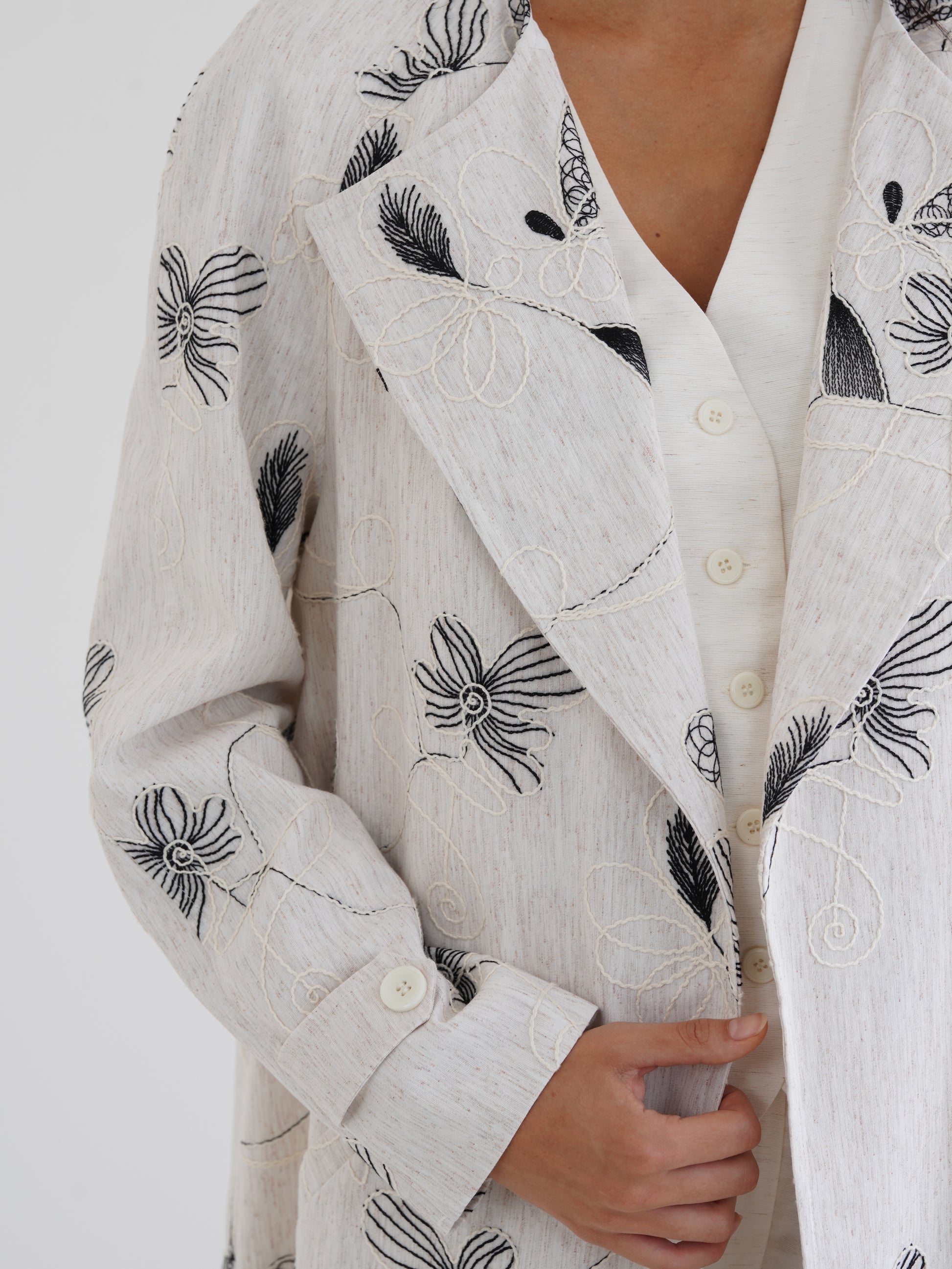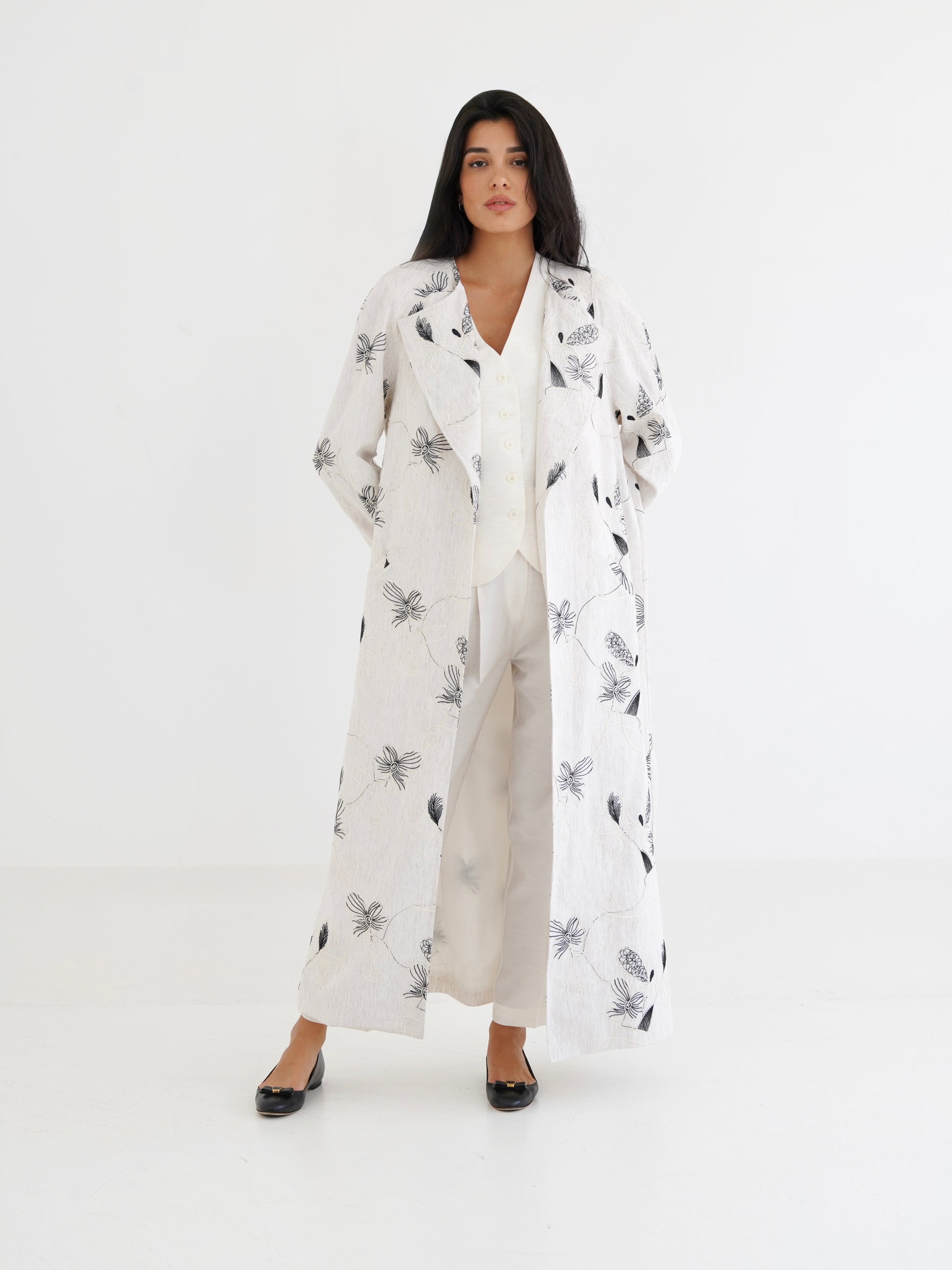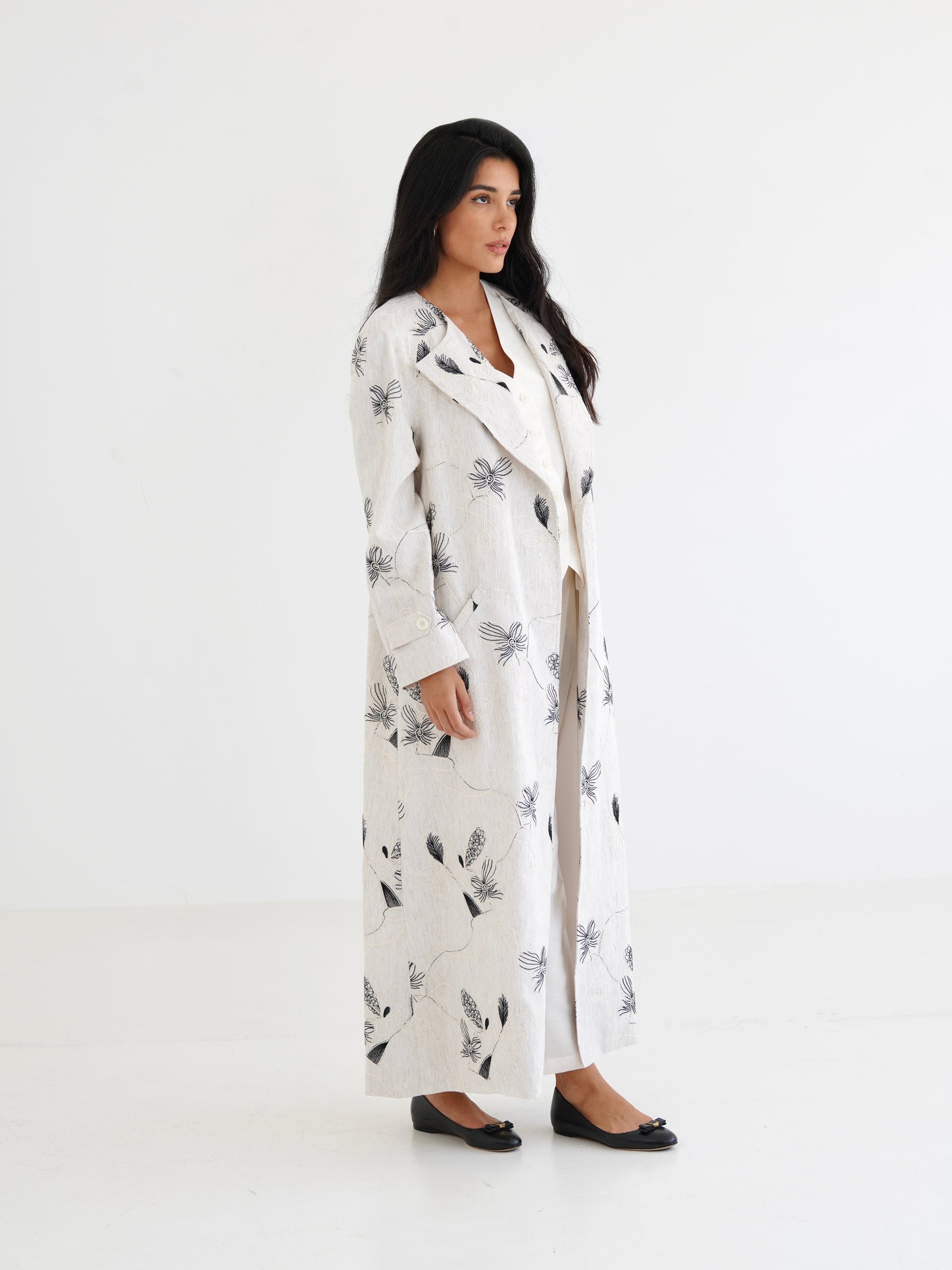 Zyra Abaya is a long, open-front design crafted in a soft neutral tone. Detailed with striking black botanical-style embroidery, it blends modern elegance with artistic flair. Lightweight and flowing, it drapes effortlessly, making it a versatile piece that can elevate both casual and formal looks.